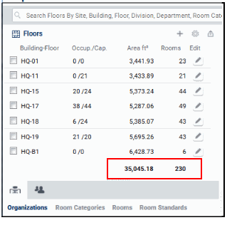 The list of floors includes basic information about the floors, such as the area and occupancy of each floor. The system totals these values for all floors displayed in the list, and presents these totals at the bottom of the list. As you change the filter, the system updates the list.