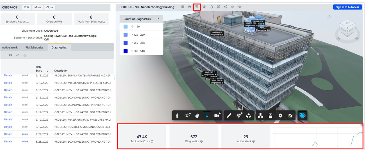 If a site has implemented a BMS system for collecting equipment diagnostics, managers can now access summary statistics directly from the BIM Viewer. This enhancement builds on V.2022.03 features, in which users could review BMS diagnostics for equipment items with active work.
