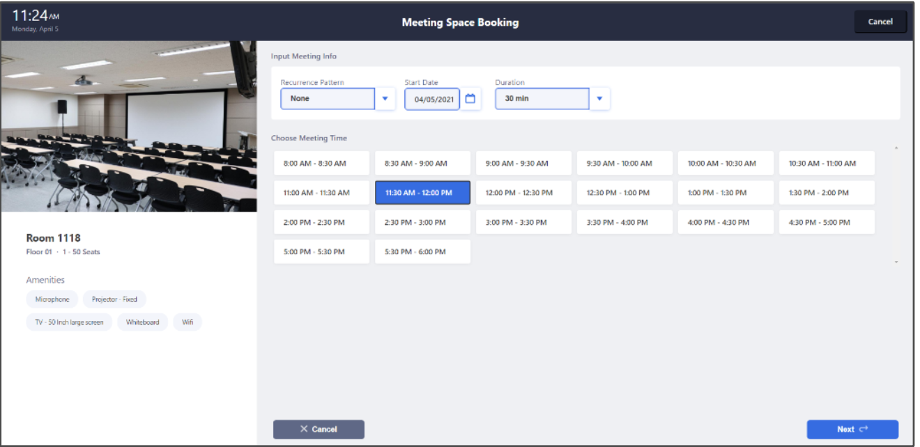 The Meeting Reservation Details and Workspace Details screens now have a Locate icon, which opens a simple popup showing the floor plan with the booked meeting room or desk highlighted in blue.
