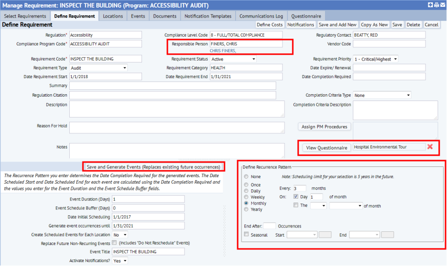 - For example, you can create an event for quarterly inspecting the facility to be sure that it is still in compliance with accessibility regulations. For the "Accessibility - Accessibility Audit - Inspect the Building" program requirement referenced above, you would create a quarterly recurring event by completing the event portion of the Manage Compliance Requirements task, as shown below.