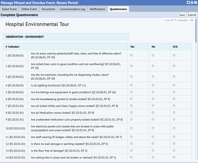 While many users will conduct inspection surveys using the Compliance Surveys mobile app, it is possible to conduct inspection surveys using Web Central. If your field personnel run Web Central on a tablet or laptop, they can travel throughout the site and record their observations using the Complete Questionnaire form, shown below.