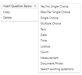 From the current question, run the Insert Question Below command, which presents the edit form for questions of this type. Complete the form, and the question is positioned immediately below the current question. If you are running this command from the ellipses menu of the Yes/No, Pass/Fail, Single Choice, Multiple Choice sections, you can add only the type of question associated with this section. |