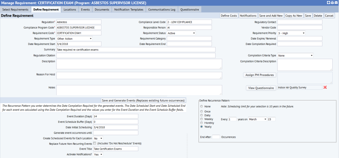 Requirements are the actions associated with your compliance programs. If a requirement has a recurring schedule, you can enter detailed scheduling information for the event, and can specify whether or not notifications should be sent. The application automates scheduling and notifications to reduce the incidence of missed or overdue events, and to simplify the process of tracking requirements.