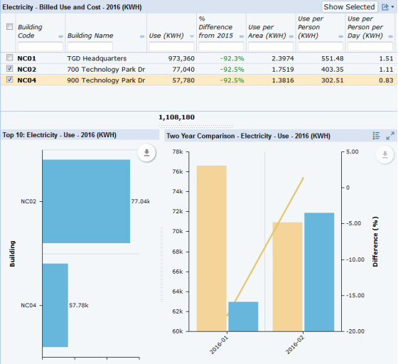 Once you set the filter, you can focus the data on a specific set of buildings. In the Bill Use and Cost pane, click on their check boxes and choose Show Selected. The other panes in the console (the charts, the map, and the equivalency statistics) will show data only for these buildings. Use the Clear option in the filter to clear the selection of buildings. This is handy for comparing the statistics for a set of buildings.