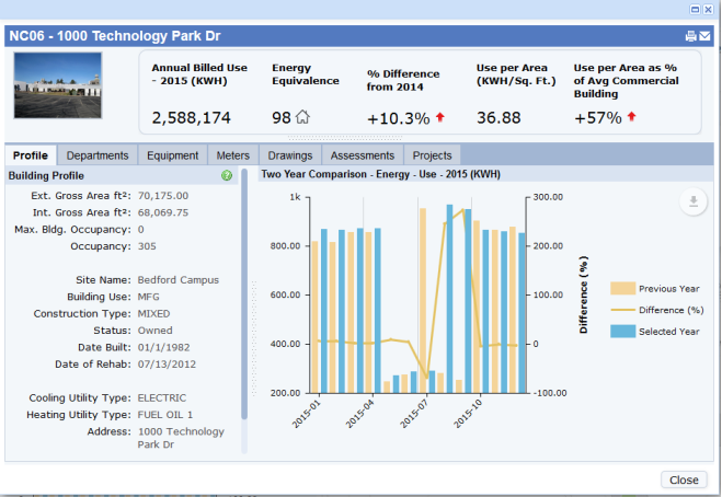 The Building Snapshot displays the Building image (bl.bldg_photo) and an Energy Equivalence panel with selected metrics, along with a series of tabs, as described below. If you notice a trend or outlier in your energy statistics, you can use this view to check a building's details and its detailed energy information.