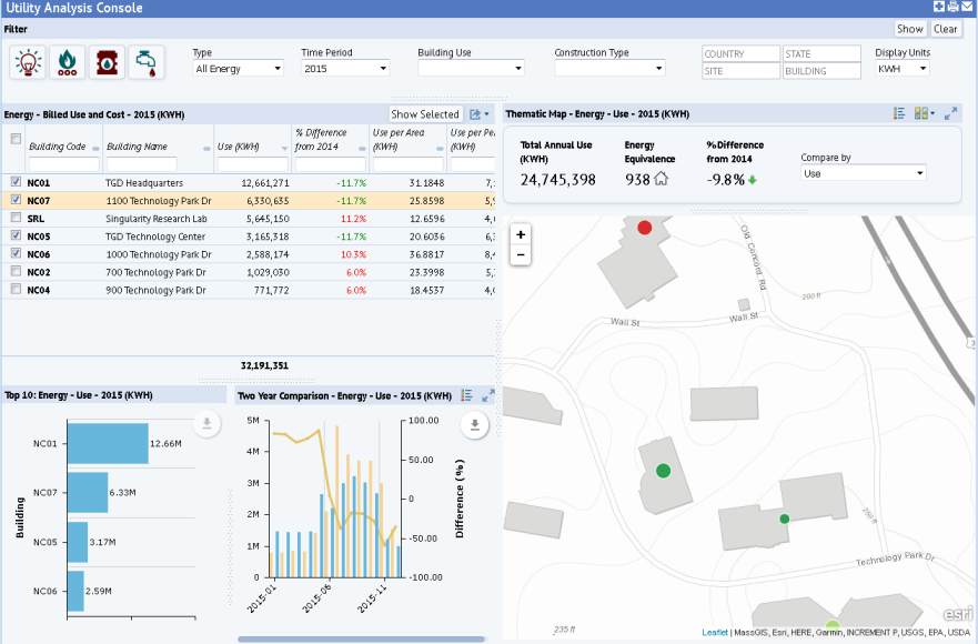 The energy manager can select a set of buildings to analyze and see the energy use by building over a two year period. Use this console to: