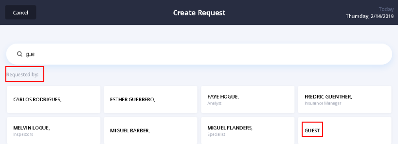 If these users create requests, they will be prompted to select who is making the request, as shown in the Request by option below. These users can choose the GUEST user from the list. Or, perhaps the user is registered in the system but did not know their user name when signing in, and so signed in as a guest. In this case, they could choose their name from the list of registered users.