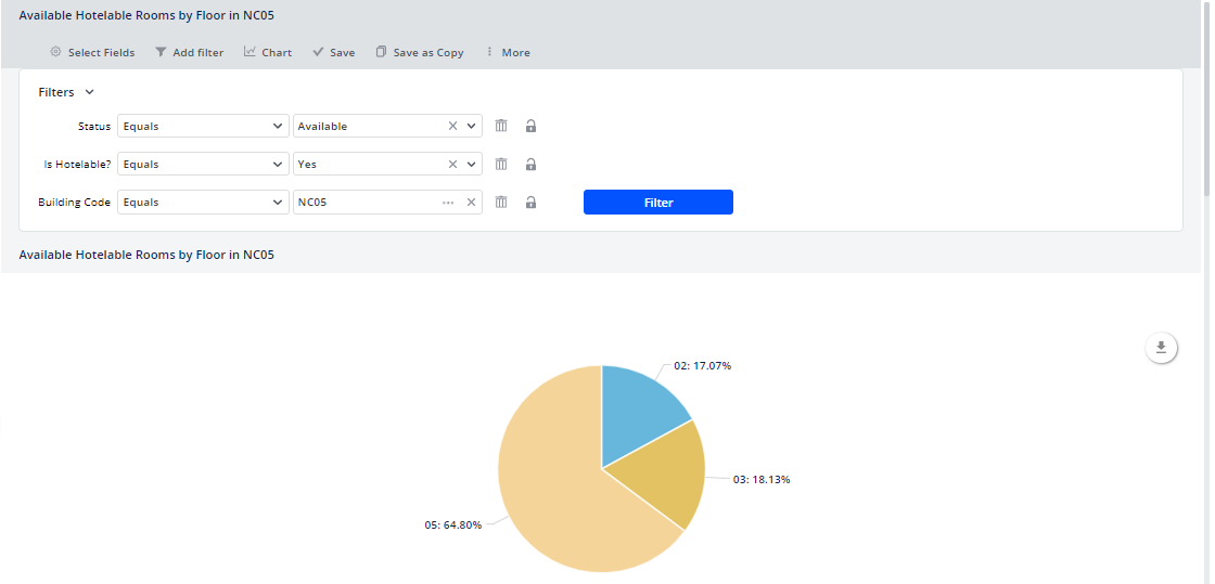 Setting the report to these values produces the following chart. You can then review the grid records for the details of the available rooms on floors 02, 03, and 05 in building NC05.