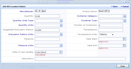 After you have assigned the material to one or more locations, you can add detailed information about the material at a particular location; for example, you may want to enter the quantity stored at each location. Click on the material listed in the panel below the floor plan. The system displays a form like the one shown above. Enter the appropriate data and click Save to store the record. When you close the form, you will see =your new values listed with the record.  For information on the fields displayed by this form, see the discussion in Assign Products to Locations Using a Form.
