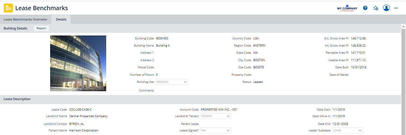 Click the Details button for a lease on the Lease Benchmarks Overview tab, and the report presents the Details tab, which lists information for the building or property the selected lease is associated with, lease description, lease areas, lease costs, lease options, and contacts. You can toggle back to the Lease Benchmarks Overview tab as necessary.