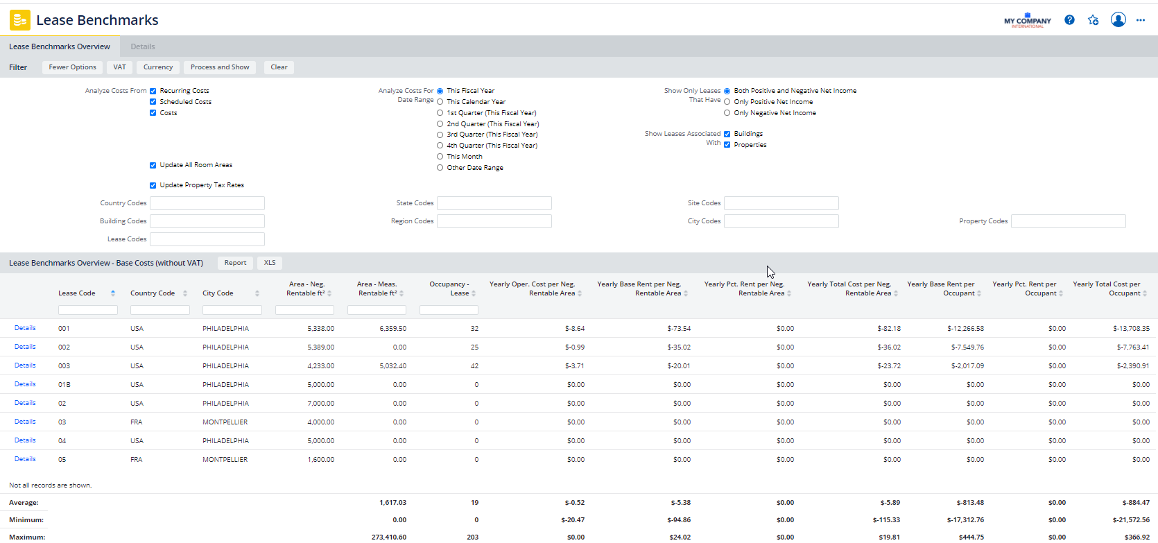 The report calculates the Average, Minimum, and Maximum for each benchmark, for the lease's negotiated area, and for lease occupancy. Having this information summarized enables you to compare a lease to the group of leases included in the report.