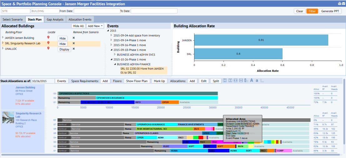 Since the work will be done by October 23, you can model that these offices will be occupied on October 26, Drag and drop the BUSINESS ADMIN-FINANCE department from JANSEN onto SRL-02 and give this event a date of 2015-10-26, as shown in the below image. The stack plan shows that the move of this department from JANSEN to SRL will take place after the renovations are complete. This completes Phase 1 of the scenario.