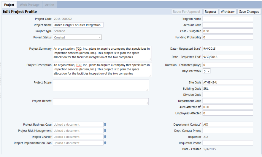 TGD, Inc. recently acquired Jansen, Inc. This example shows using a portfolio scenario, along with a project, to develop a strategy for moving Jansen’s departments from the JANSEN building to TGD's buildings (building SRL and other buildings if needed).