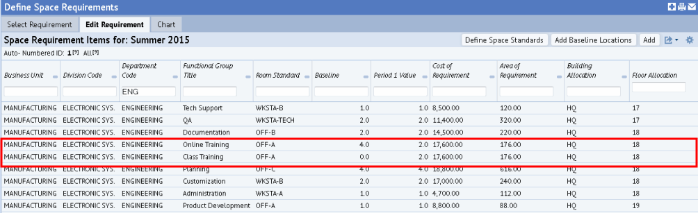 Notice that Online Training and Class Training are both have the OFF-A room standard. In this case, the system generated one Space Requirement Item record for the OFF-A standard. However, this record did not tell the complete picture of the organization so the planner edited and created new records.