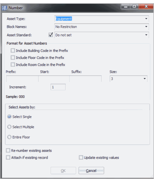 Asset TypeSelect the type of asset you are numbering, such as rooms or suites. The list shows asset types that have one or more occurrence in the current drawing.