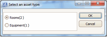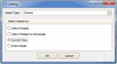 If there is a selected set of elements, when you click the Catalog command from the Ribbon, the catalog functionality processes only those selected elements. If multiple types of Revit elements (for example, both Rooms and Equipment) are included in pre-selected elements, you are prompted to select the asset type you want to catalog.