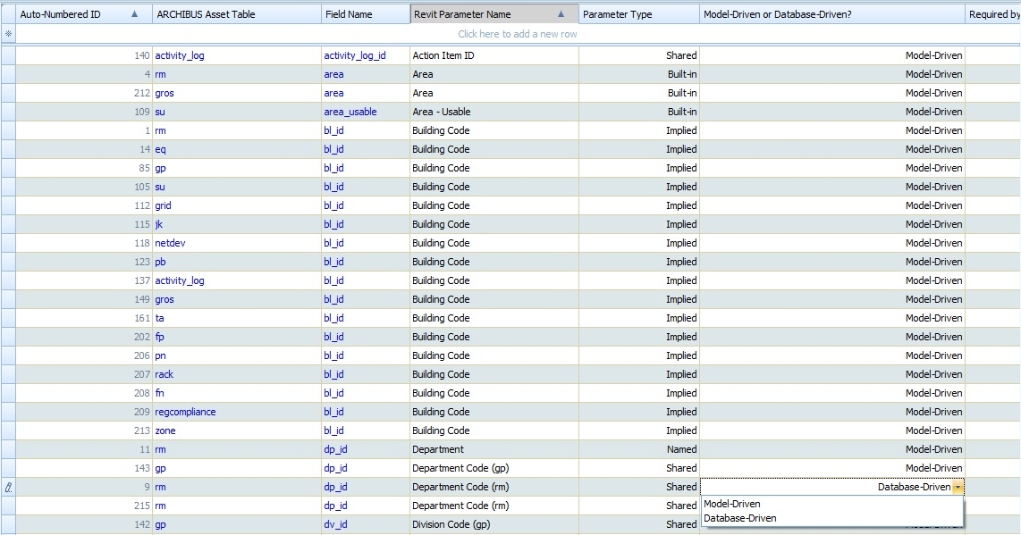 You change the Source Setting for the field from the Smart Client using the System / CAD and BIM Manager / Archibus BIM Parameters task. You select Model-driver or Database-driven from the list in the Model-Driven or Database-Driven? column.