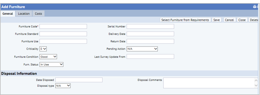 Furniture Code: This is the unique identifier for the record, and is a required field.