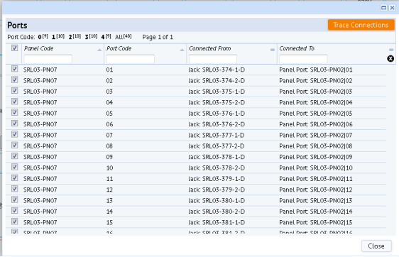 - If you have chosen an item with sub-items (such as jacks or ports), the system presents a form so you can choose one or multiple ports or jacks for which to trace connections. Select the items, and choose the form's Trace Connections button.