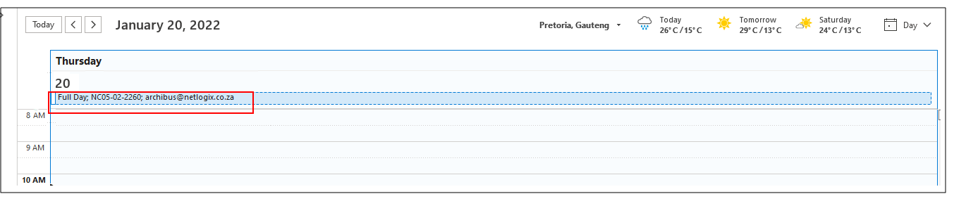 Los empleados que reserven escritorios antes de llegar a la oficina tal vez quieran que dicha reserva se muestre en sus calendarios de Outlook u O365. Cuando abran Outlook por la mañana, podrán ver la reserva y sabrán qué escritorio deben ocupar.
